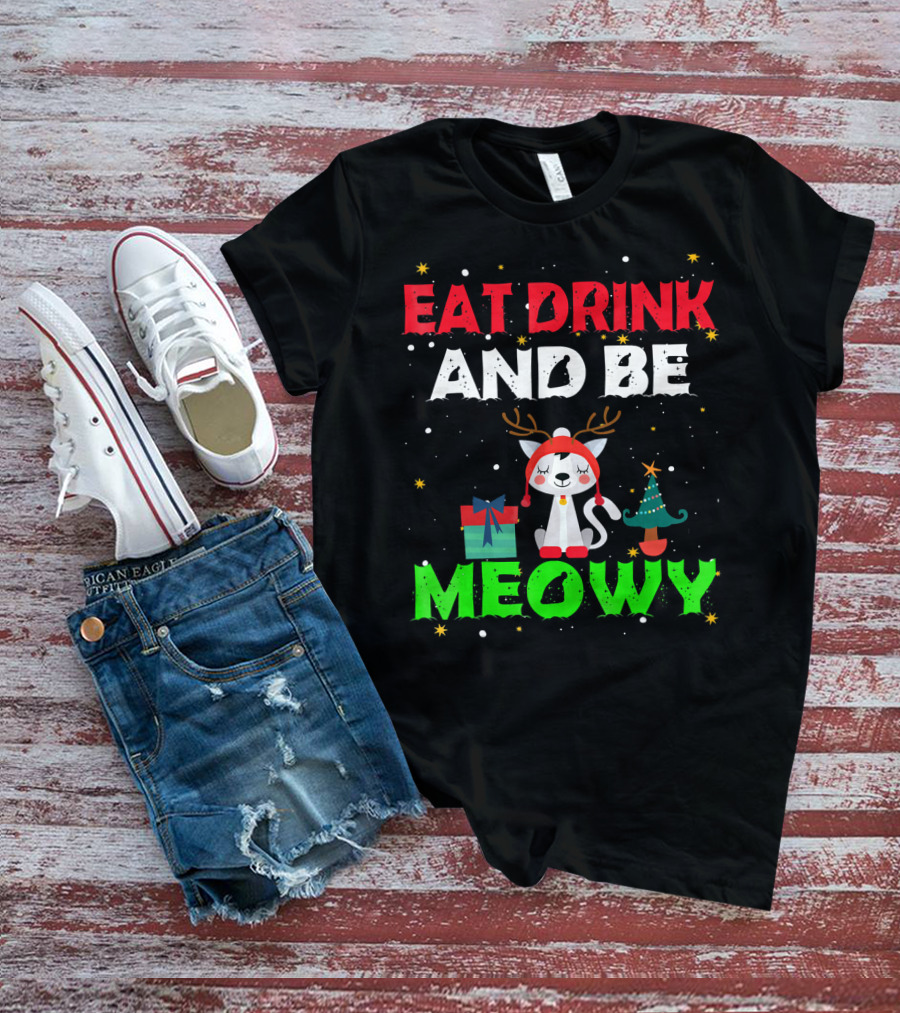 Eat Drink And Be Meowy Cat With Reindeer Antlers Holiday Motif T-Shirt