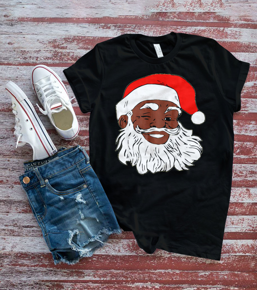The Black Santa Claus Winking in Red Hat Shirt offers a regular fit. Made from 100% ring-spun cotton that is pre-shrunk to help maintain size and shape after washing. Features reinforced construction details for durability. Available in U.S. standard sizes S-5XL to accommodate various body types.