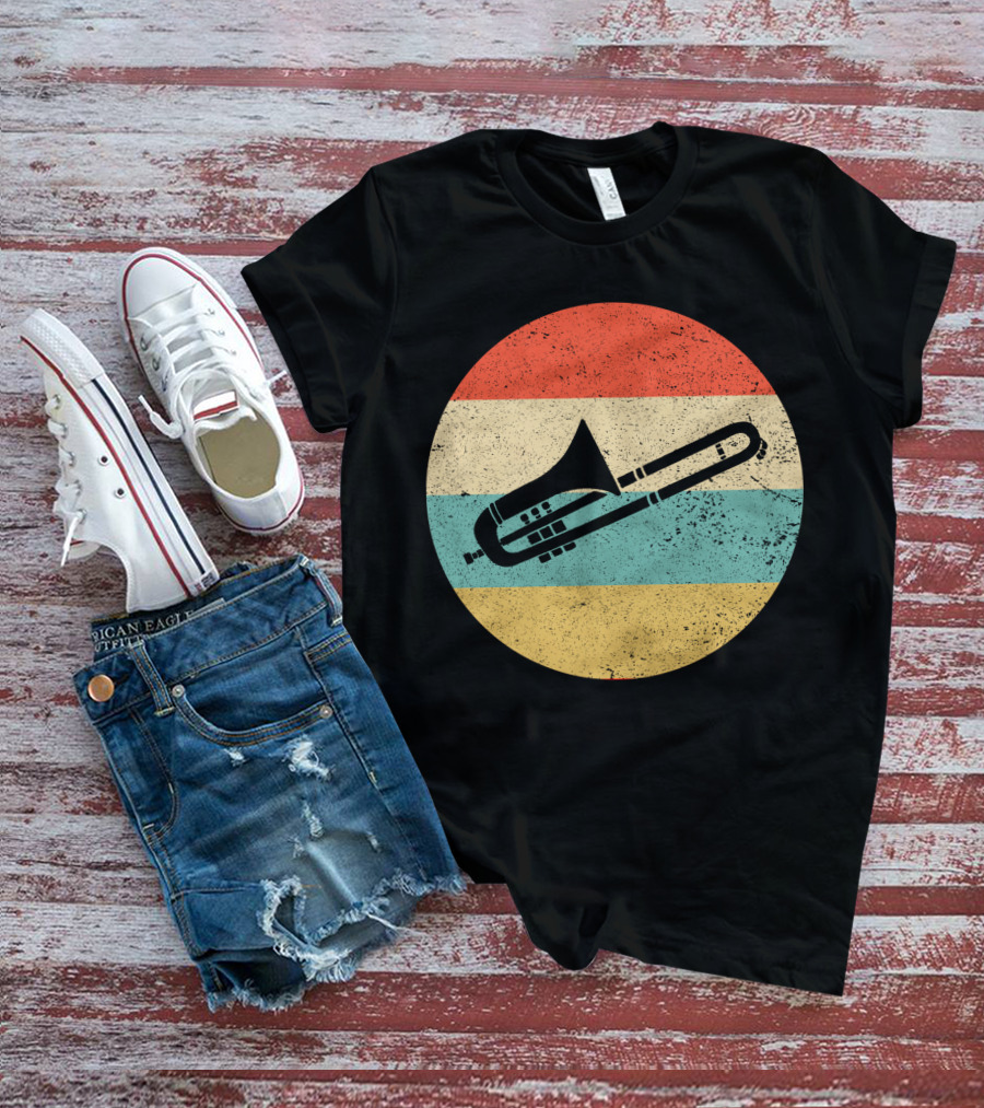 The Vintage Retro Trombone Graphic on Striped Circle Background Shirt offers a regular fit. Made from 100% ring-spun cotton that is pre-shrunk to help maintain size and shape after washing. Features reinforced construction details for durability. Available in U.S. standard sizes S-5XL to accommodate various body types.