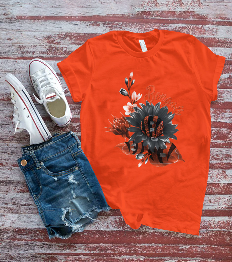 The Bengals Flower Graphic With Orange And Black Elements Shirt offers a regular fit. Made from 100% ring-spun cotton that is pre-shrunk to help maintain size and shape after washing. Features reinforced construction details for durability. Available in U.S. standard sizes S-5XL to accommodate various body types.
