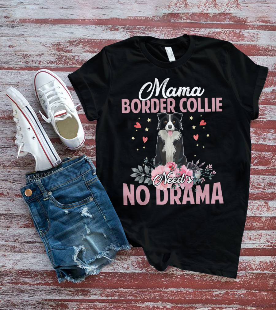 Mama Border Collie Need's No Drama Hearts Flowers T-Shirt