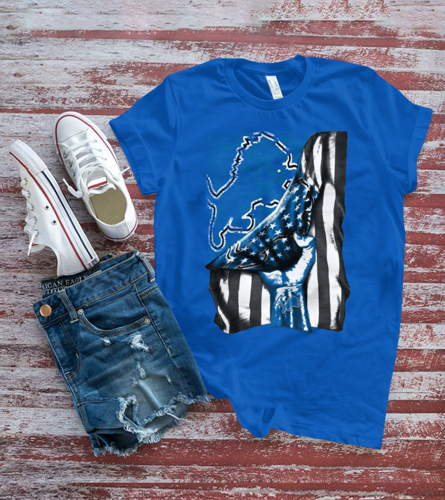 Detroit Lions Blue Lion Silhouette With American Flag Fist On Blue T-Shirt