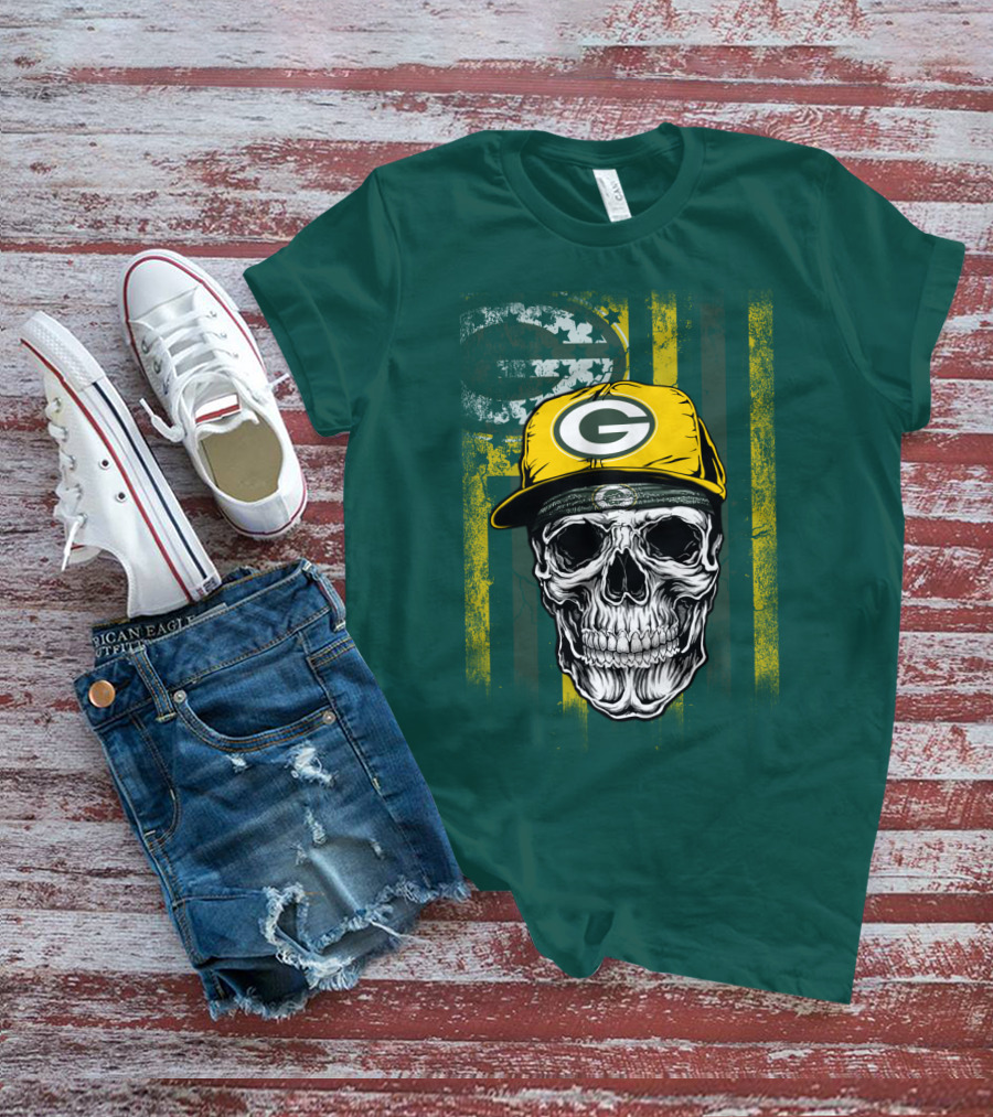 Green Bay Packers Skull With Cap And Distressed Flag T-Shirt