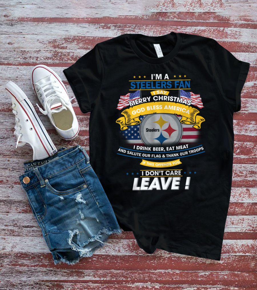 I'm A Steelers Fan Merry Christmas God Bless America I Drink Beer Eat Meat Salute Our Flag Thank Our Troops If This Offends You I Don't Care Leave T-Shirt