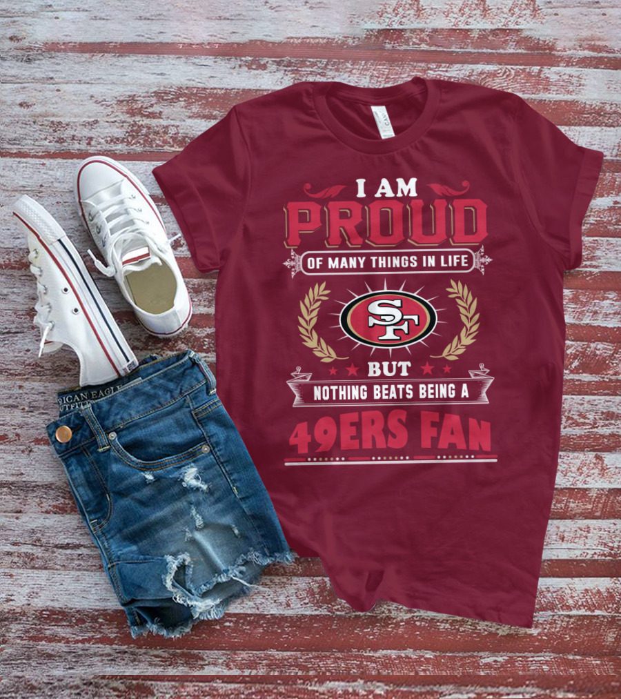 The I Am Proud Of Many Things In Life But Nothing Beats Being A San Francisco 49ers Fan Shirt offers a regular fit. Made from 100% ring-spun cotton that is pre-shrunk to help maintain size and shape after washing. Features reinforced construction details for durability. Available in U.S. standard sizes S-5XL to accommodate various body types.