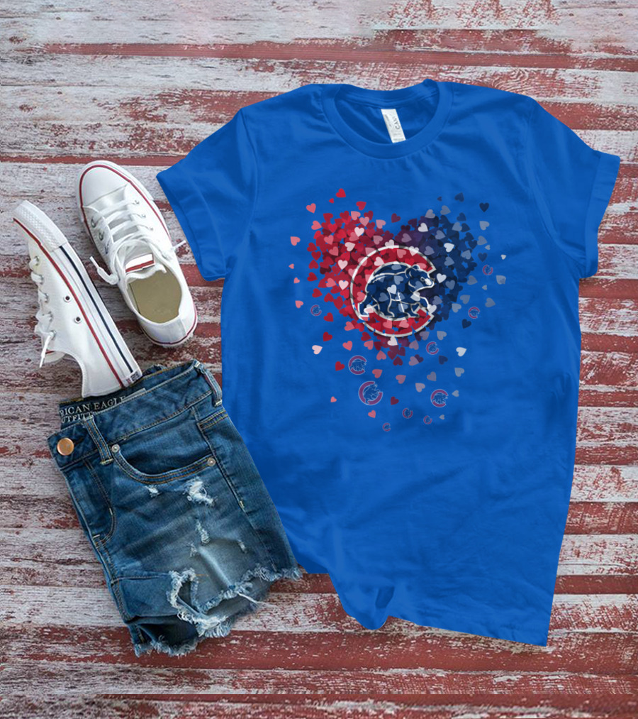 Chicago Cubs Heart Pattern With Bear Logo And Hearts In Red White And Blue T-Shirt