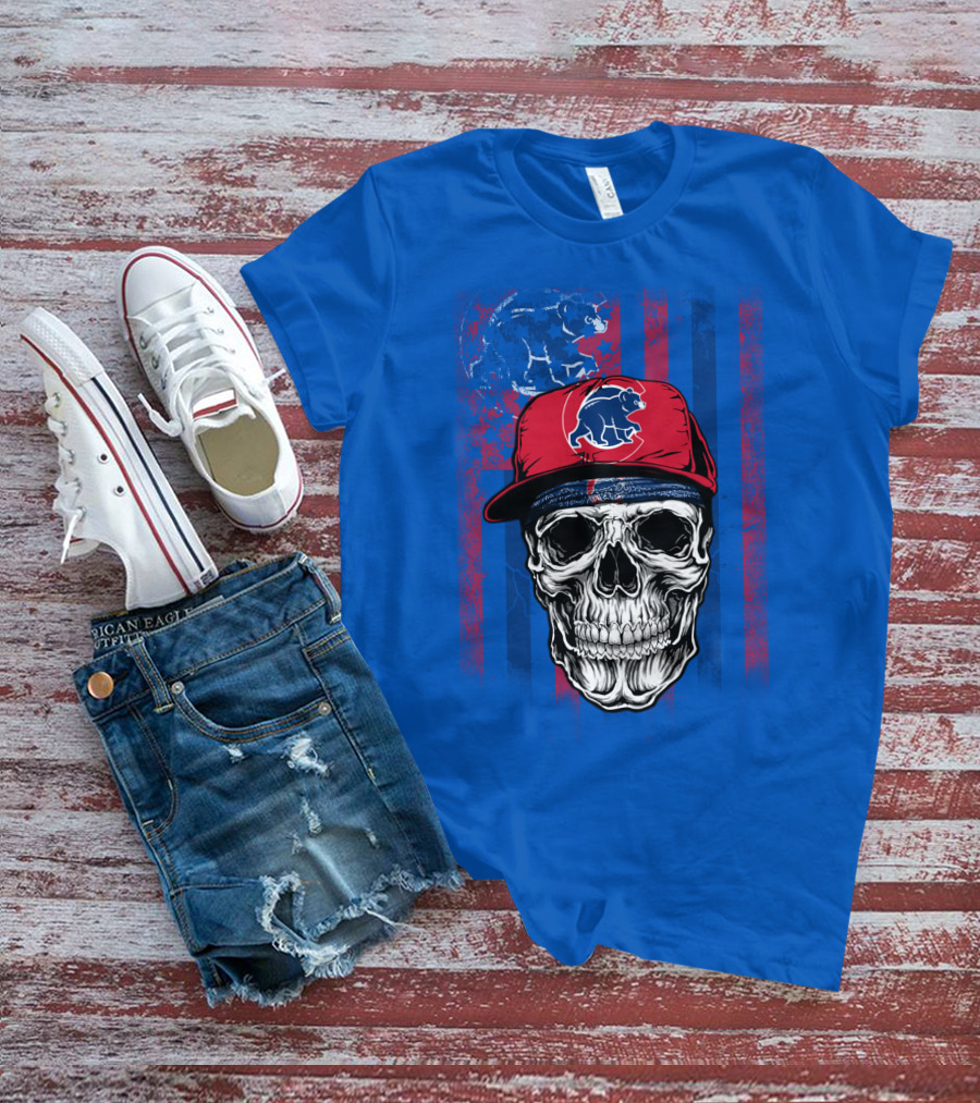 Chicago Cubs Skull With Bear And Cap On Blue T-Shirt