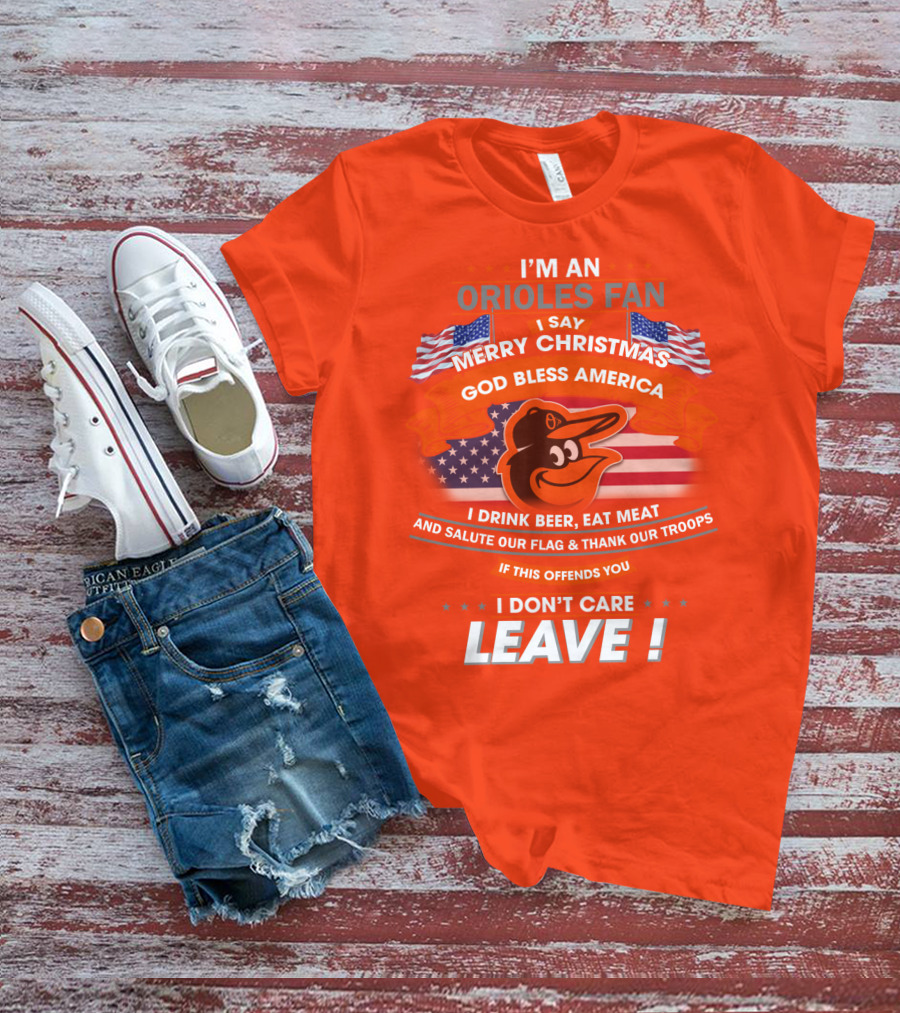 I'm An Orioles Fan I Say Merry Christmas God Bless America I Drink Beer Eat Meat And Salute Our Flag & Thank Our Troops If This Offends You I Don't Care Leave T-Shirt