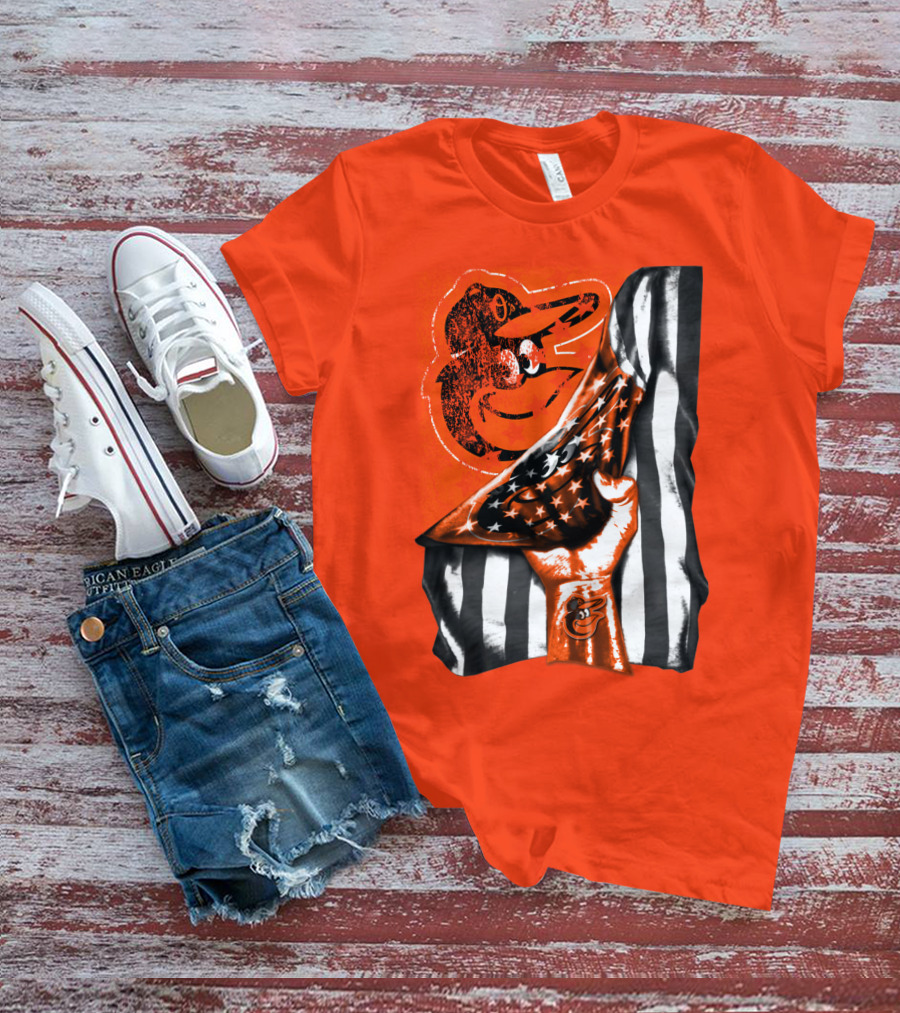 Baltimore Orioles American Flag Fist Logo On Orange T-Shirt