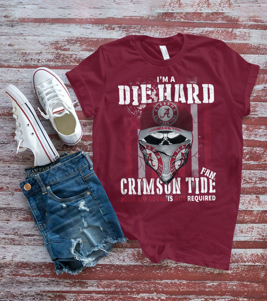 The I'm A Die Hard Alabama Crimson Tide Fan Your Approval Is Not Required Shirt offers a regular fit. Made from 100% ring-spun cotton that is pre-shrunk to help maintain size and shape after washing. Features reinforced construction details for durability. Available in U.S. standard sizes S-5XL to accommodate various body types.