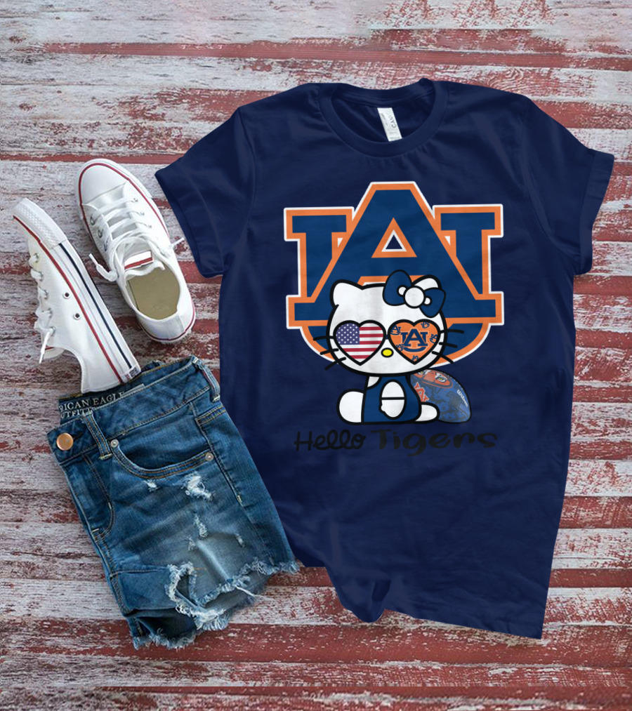 Hello Tigers Auburn Kitty Football American Flag T-Shirt
